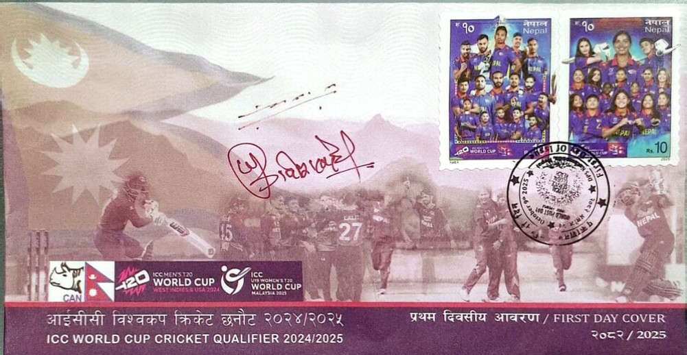 नेपाली क्रिकेट टिमको तस्बिर अंकित हुलाक टिकटमा बिहीबार सञ्चार तथा सूचना प्रविधिमन्त्री जगदीश खरेल र राष्ट्रिय खेलकुद परिषद्का सद्स्य–सचिव टंकलाल घिसिङले प्रथमदिवसीय टाँचा लगाएका हुन् ।